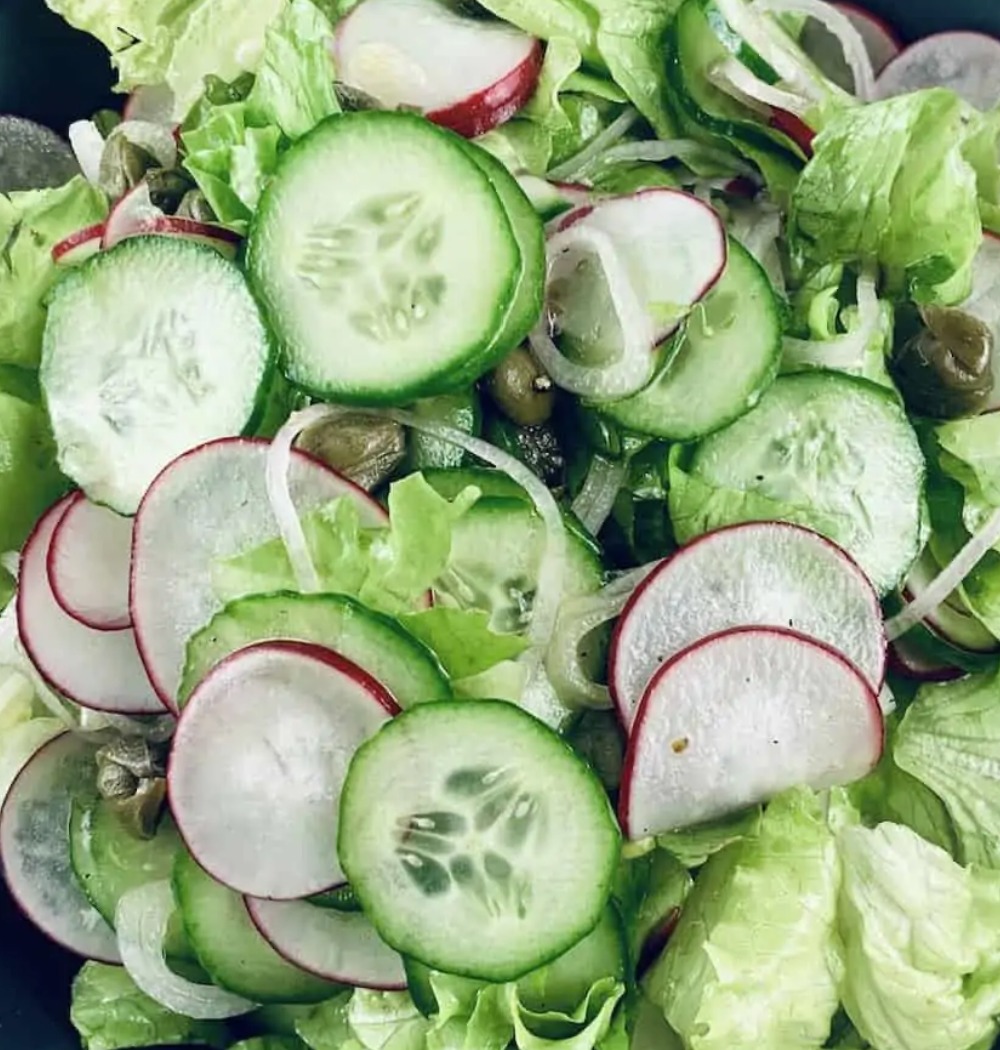 Consists of cucumber, onion, carrots, tomato, and cabbage topped