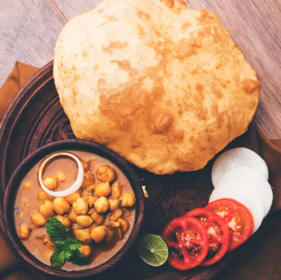 Fluffy deep-fried flatbread served with flavorful chickpea curry, cooked with aromatic spices and herbs.