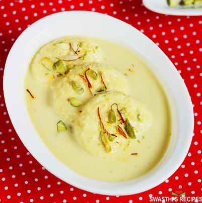 Soft cheese dumplings soaked in a cardamom and saffron milk