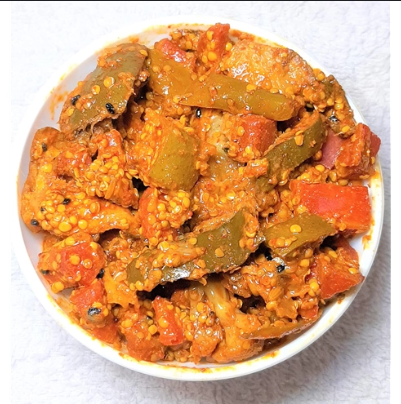 Goat cooked in a gravy with onion, tomato and bell pepper garnished with fresh ginger.